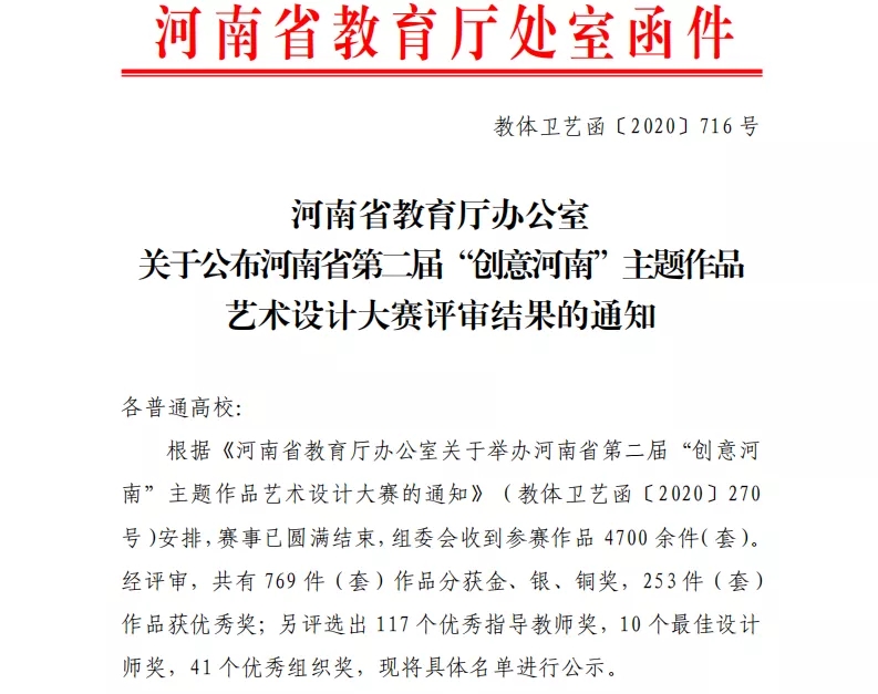 近日,河南省教育厅办公室下发《关于公布河南省第二届“创意河南”主题作品艺术设计大赛评审结果的通知》(教体卫艺函〔2020〕716号),我校在比赛中表现优异,斩获金奖1项,银奖3项,铜奖9项,优秀奖2项,优秀辅导教师1项。同时,我校获得“优秀组织奖”荣誉称号。