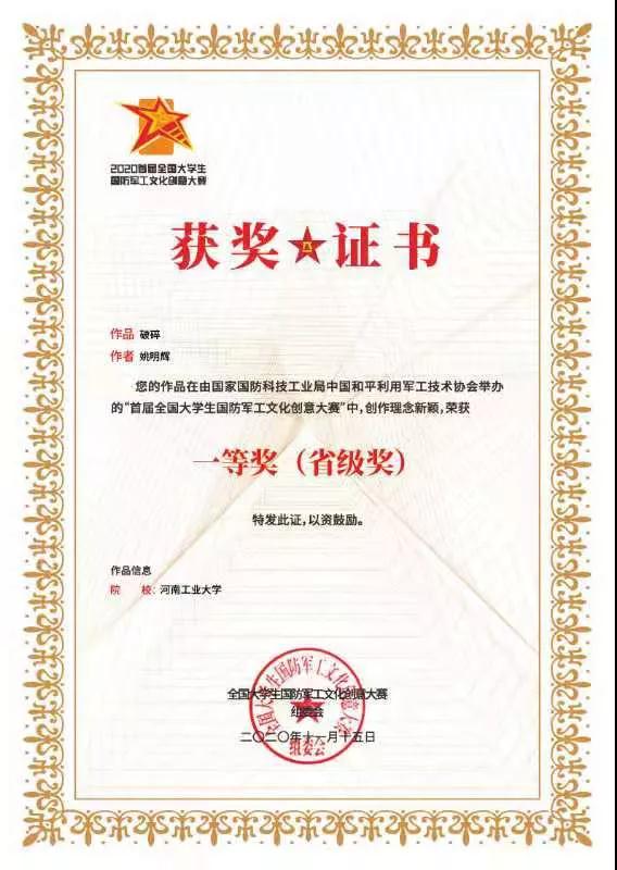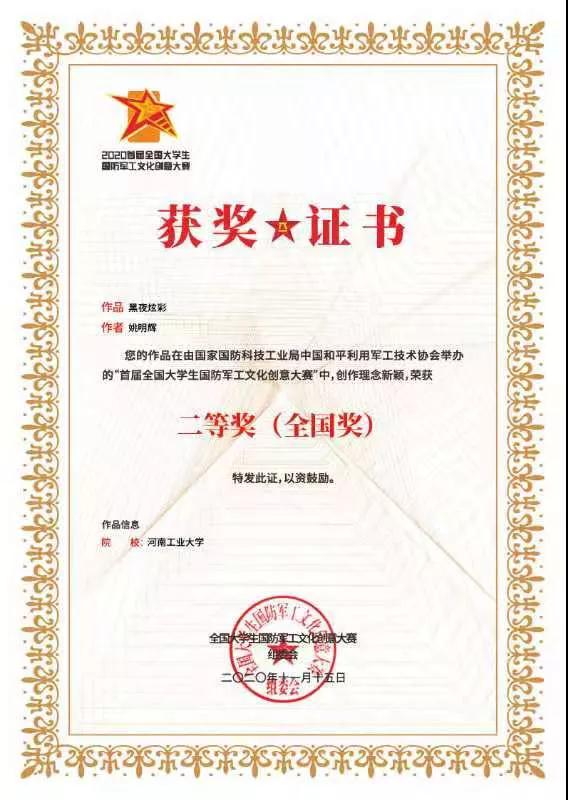 近日,2020首届全国大学生国防军工文化创意大赛结果揭晓,河南工业大学漯河工学院艺术学院姚明辉同学的作品《黑夜炫彩》荣获全国二等奖、《破碎》荣获全省一等奖,张警辉同学的作品《包装设计》荣获全国二等奖。