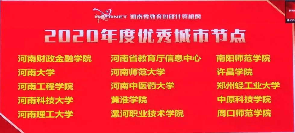 1月19日,河南省教育科研计算机网2021年工作会议在线上举办,对河南省教育科研计算机网2020年度优秀城市节点与IPv6规模部署工作先进单位进行了表彰,我校在河南省高校网络建设和信息化工作中表现突出,喜获“2020年度优秀城市节点”荣誉称号。