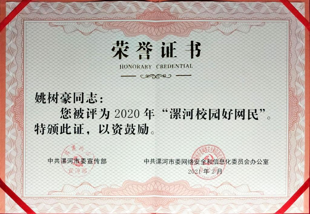 近日,由漯河市委宣传部、市委网信办组织开展的2020年“出彩添彩 争做漯河好网民”评选活动圆满落下帷幕。经过层层筛选和综合评定,河南工业大学漯河工学院建筑工程学院的姚树豪同学从全市各单位推荐和自主推荐的88名好网民人选中脱颖而出,被授予2020年“漯河校园好网民”荣誉称号。