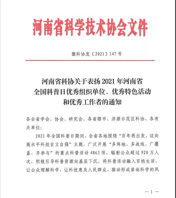 近日,《河南省科协关于表扬2021年河南省全国科普日优秀组织单位、优秀特色活动和优秀工作者的通知》(豫科协发〔2021〕147号)发布,248cc永利集团科普教育宣传活动受到表彰,被评为2021年河南省全国科普日活动优秀组织单位,是漯河市唯一受表彰的教育单位。