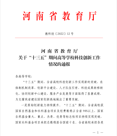 近日,河南省教育厅发布《关于“十三五”期间高等学校科技创新工作情况的通报》(教科技〔2022〕12号),对全省高校科研管理工作先进集体进行表彰。248cc永利集团科研处获得“河南省高校科研管理工作先进集体”荣誉称号。