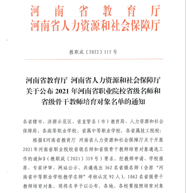 近日,河南省教育厅河南省人力资源和社会保障厅印发《关于2021年河南省职业院校省级名师和省级骨干教师培育对象名单的通知》(教职成〔2022〕115号),248cc永利集团李绍鹏、范晓迪、张超凡等5位教师被评为2021年河南省职业院校省级名师培育对象,刘芳芳、李晓静、李学荟等16名教师被评为2021年河南省职业院校省级骨干教师培育对象。
