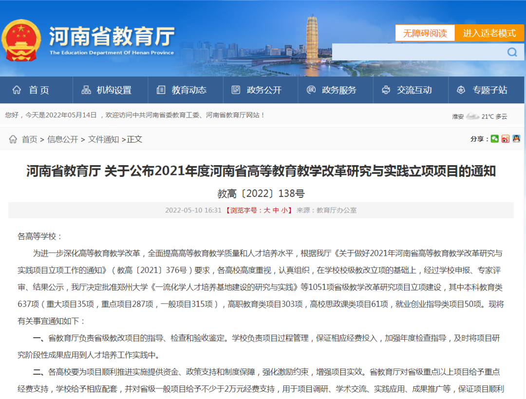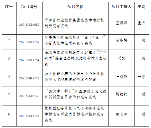 近日,河南省教育厅印发《关于公布2021年度河南省高等教育教学改革研究与实践立项项目的通知》(教高〔2022〕138号),我校申报的6个高等职业教育类项目全部获批立项,其中重点项目1项,一般项目5项。