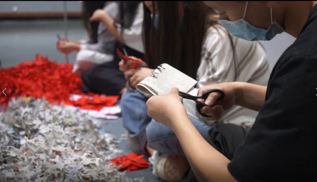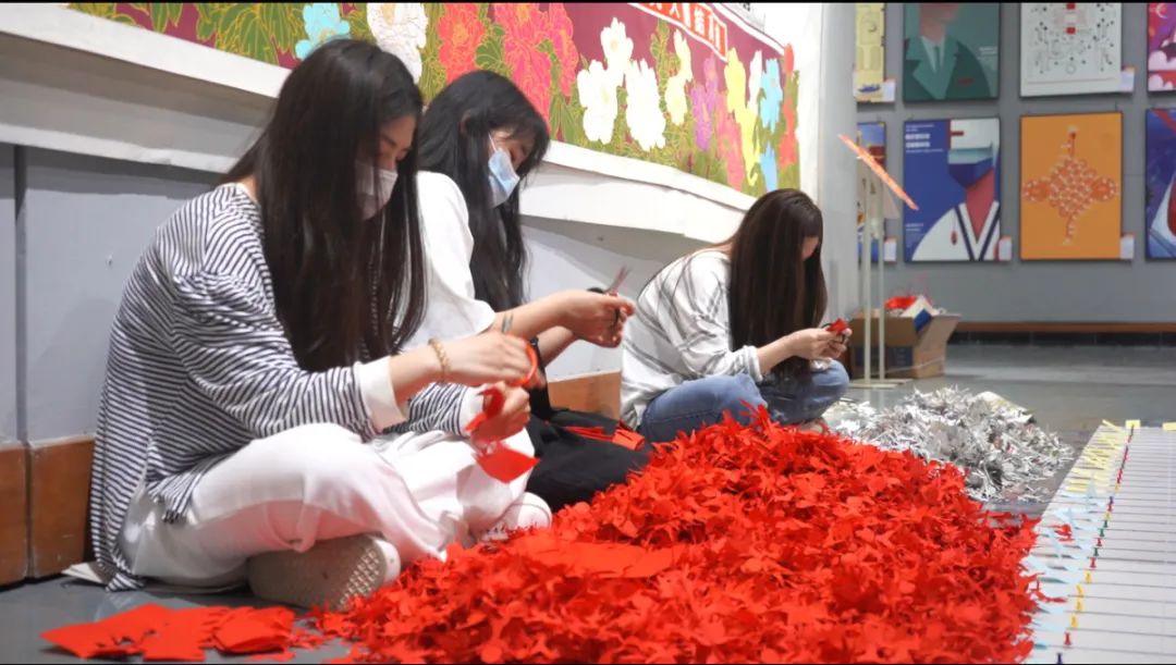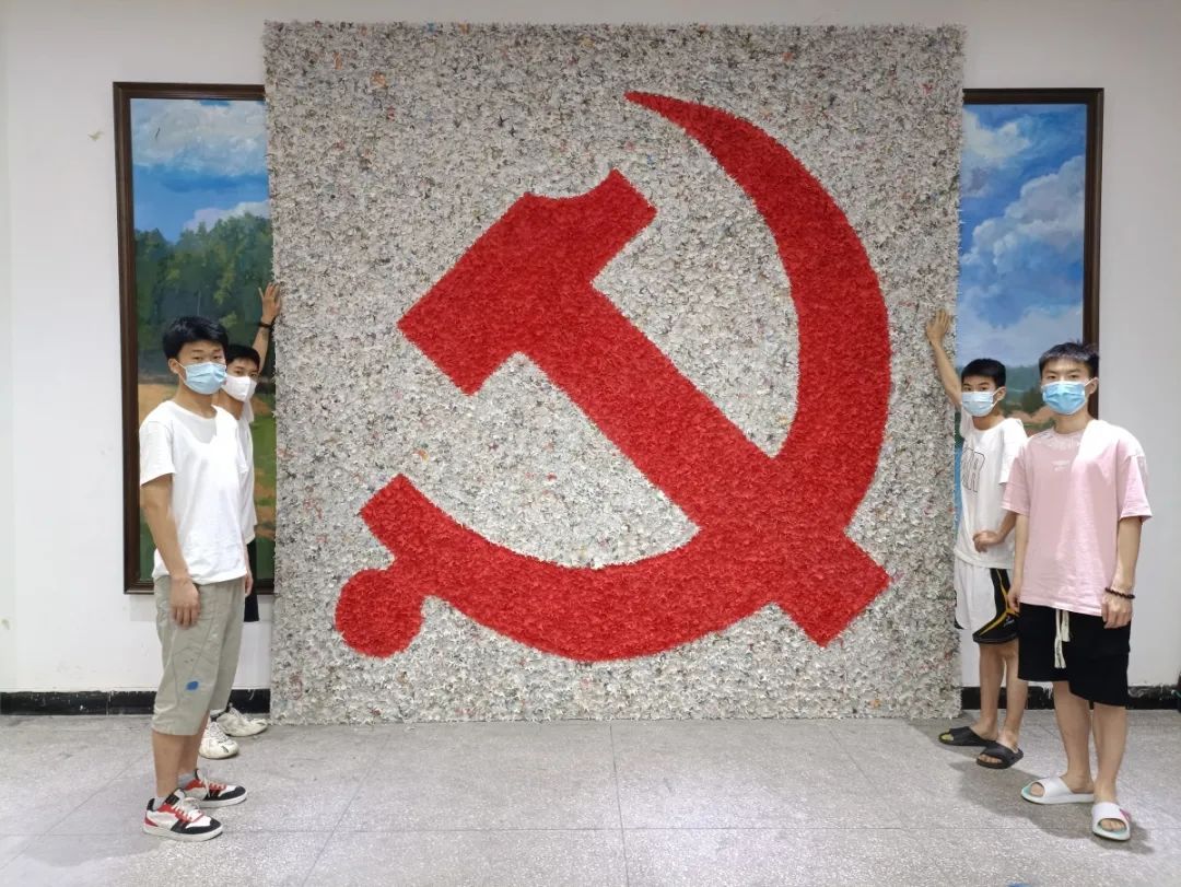 据了解,这件作品为正方形,边长3.6米,主题为鲜艳的红色党徽,以白色衬底,使用了红色宣纸、报纸、喷胶、泡沫板等材料,在艺术学院陈明杰老师的指导下,先后有14位同学参与制作,从最初构思到设计草稿,剪纸,拼贴,足足用了三个月才完成。走近观看这件作品,会发现图案是由一个个抓髻娃娃样式的剪纸一点点拼贴而成,效果十分震撼。20万个传统造型的抓髻娃娃寓意为祖国祈福,愿疫情早日过去,国泰民安,拼剪出的党徽样式表达了当代大学生永远跟党走,奋进新征程,共同迎接党的二十大胜利召开,一起奔向美好未来的主题思想。