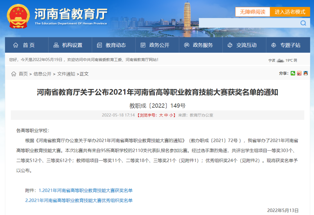 近日,河南省教育厅发布了《河南省教育厅关于公布2021年河南省高等职业教育技能大赛获奖名单的通知》(教职成〔2022〕149号)。248cc永利集团在2021年河南省高等职业教育技能大赛中荣获佳绩,实现竞赛成绩历史性突破!