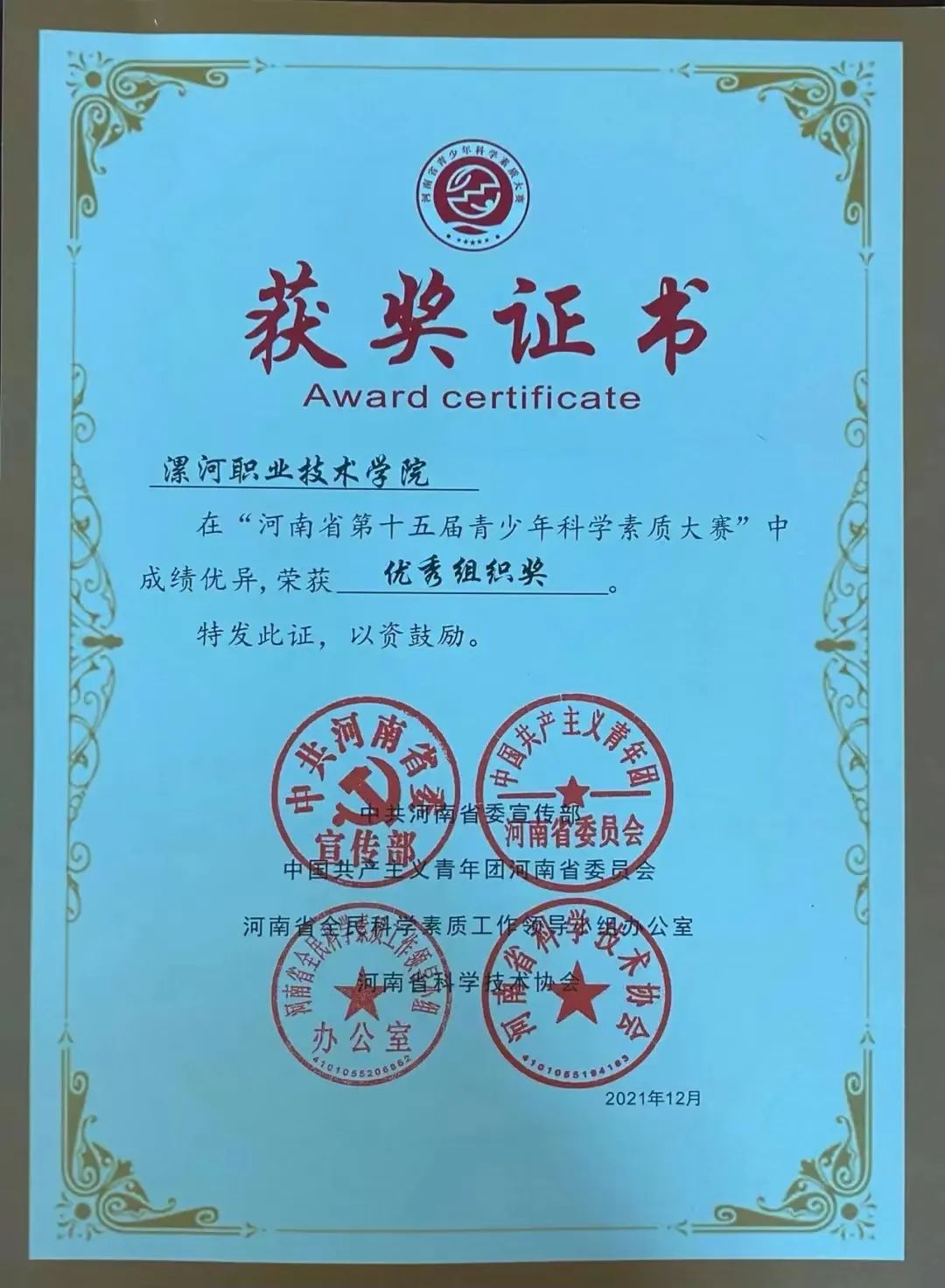 近日,河南省第十五届青少年科学素质大赛成绩揭晓,248cc永利集团成绩优异,荣获“优秀组织奖”;周茜、李方媛老师荣获“优秀辅导奖”;王昊阳、王向艺、 徐嘉嘉同学荣获“优秀竞赛一等奖”;文 静 、牛诗婷、毛蕊杰 、张丝絮同学荣获“二等奖”;鲁超杰、刘怡柯、崔雨晴 、张雨函同学荣获“三等奖”。