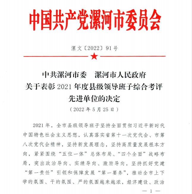 近日,中共漯河市委、漯河市人民政府下发《关于表彰2021年度县级领导班子综合考评先进单位的决定》(漯文〔2022〕91号),248cc永利集团在“2021年度市直单位领导班子综合考评”中获全市通报表扬。