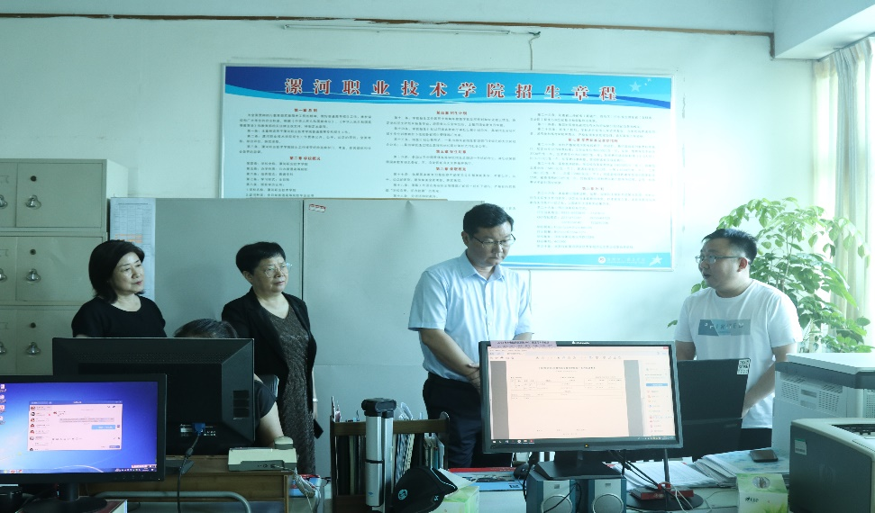 易军鹏一行实地视察了招生就业处的办公条件和环境,认真听取了招生就业处负责人的汇报,重点了解我校的招生录取批次和今年艺术类、体育类、对口类各专业的录取进展情况。易军鹏对我校目前的招生录取工作取得的成绩给予了肯定和表扬,并要求要严格按照省教育厅和省教育考试院的规章制度,确保招生录取工作做到“公平、公正、阳光”。易军鹏强调,为适应新形势下招生、就业工作高效运转的要求,要切实提升服务水平,科学规划,着力打造一个科学、规范、合理的招生、就业服务平台。