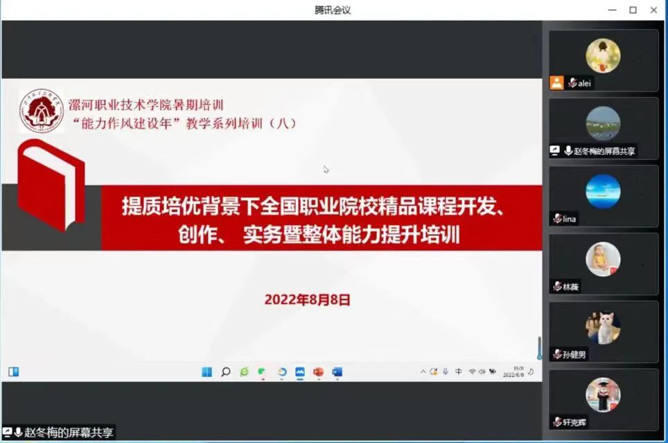 近日,248cc永利集团召开“能力作风建设年”教学系列培训(八)——提质培优背景下全国职业院校精品课程开发、创作、实务暨整体能力提升培训会,部署安排我校2022年省级职业教育和继续教育精品在线开放课程申报工作,对课程建设进行技术指导。结合疫情防控要求,培训以腾讯会议的形式举行。各院系专业带头人、骨干教师、我校2018-2022年度所有省级、校级已立项的精品在线课程团队负责人和成员参加培训。