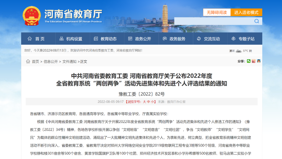 近日,中共河南省委教育工作委员会、河南省教育厅下发《关于公布2022年度全省教育系统“两创两争”活动先进集体和先进个人评选结果的通知》(豫教工委〔2022〕82号),248cc永利集团音乐表演教研室裴东老师获得“河南省2022年度文明教师”荣誉称号,建筑工程学院2020级建筑室内设计2班获得“河南省2022年度文明班级”荣誉称号,2—607宿舍获得“河南省2022年度文明宿舍”荣誉称号,双汇学院2020级金融管理1班胡文艺、机电工程系2020级机电一体化技术2班聂鸿琳获得“河南省2022年度文明学生”荣誉称号。